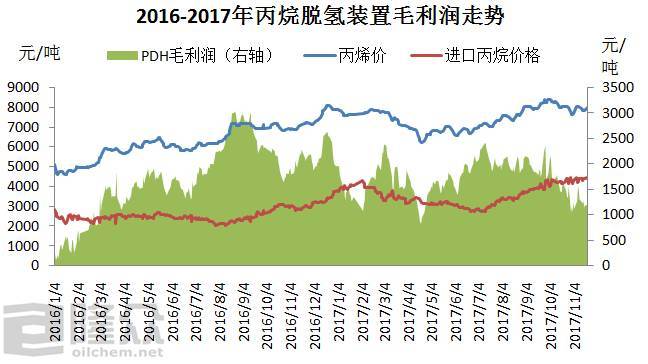 近年来,丙烷脱氢工艺在我国得以迅速发展,一方面是丙烯需求旺盛,供应有缺口;另一方面装置利润优势明显,是得以迅速发展的主因。虽然近几年国际油价一路下滑并在低位震荡,大宗商品行情并不乐观,丙烯价格也有明显回落,但作为原料气的丙烷价格低位,这也保证了丙烷脱氢工艺的利润保持良好,这也是华南地区也开始布局丙烷脱氢项目的重要原因。